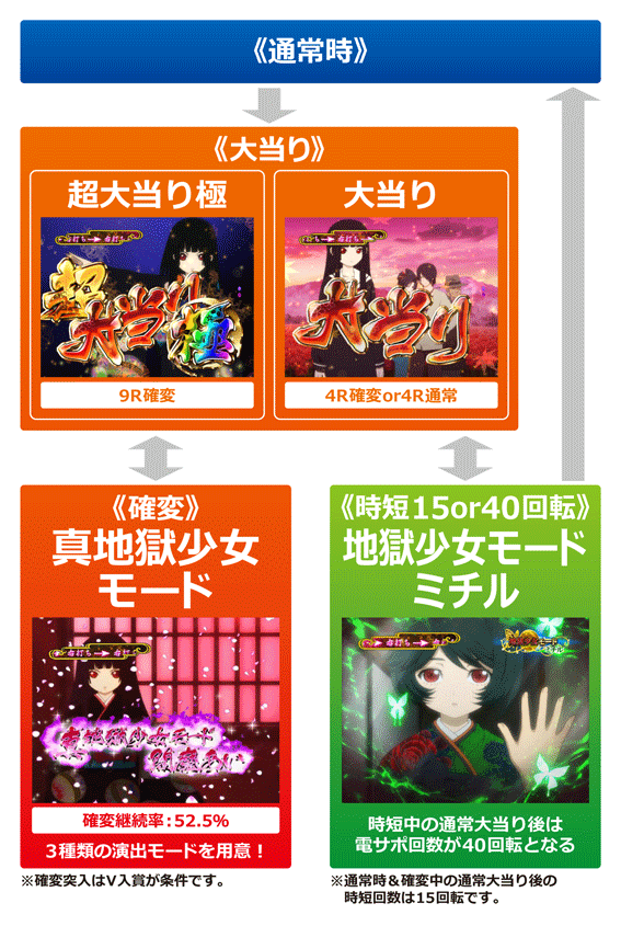 地獄少女図柄以外の図柄揃いで発生。ラウンド中の昇格演出成功で4R確変&真地獄少女モード突入、失敗で4R通常大当り&時短突入となる。