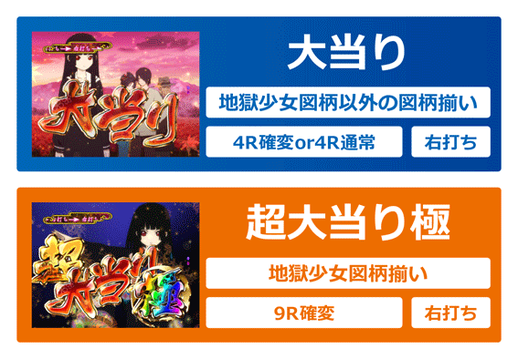 地獄少女図柄が揃うと発生する9R確変大当り。終了後は真地獄少女モードに突入する。