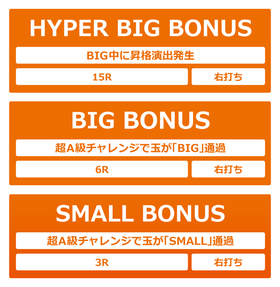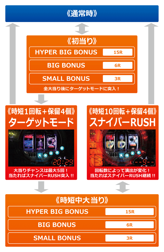 BIG中に昇格演出が発生するとHYPER BIG BONUSとなり、15Rに昇格。終了後はターゲットモードorスナイパーRUSHに突入する。