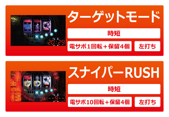 初回大当り後に突入。時短回数は1回転のみだが、保留を4個まで貯められるため最大5回の大当りチャンスがある(電サポ中の1回転あたりの大当り確率は10.3分の1)。当たればラウンド終了後にスナイパーRUSHへ突入する。