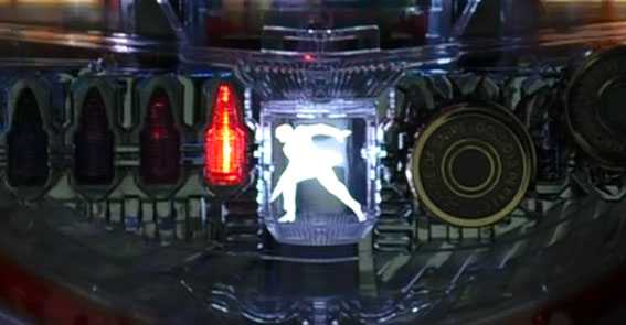 図柄揃い後に発生するラウンド決定演出。まず、左打ちで上アタッカーに玉を入れると、玉がドラムの中リール下部へ移動。次に、リール役物によって玉が上昇し、最終的に「BIG」の穴に入れば6Ror15R、「SMALL」の穴に入れば3Rの大当りとなる。
