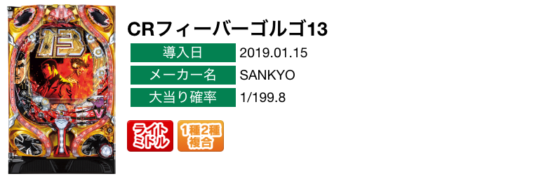 さいとう・たかを原作の日本最長寿漫画とのタイアップ機。スペックは大当り確率1/159.8の1種+2種タイプで、大当り後は時短1回+最大保留4個の「ターゲットモード」に突入する。この間に引き戻せば時短10回+最大保留4個の「スナイパーRUSH」に突入。スナイパーRUSH継続率は時短10回の約64%プラス最大保留4個分の約33%も加わるため、連チャン期待度は高めだ。