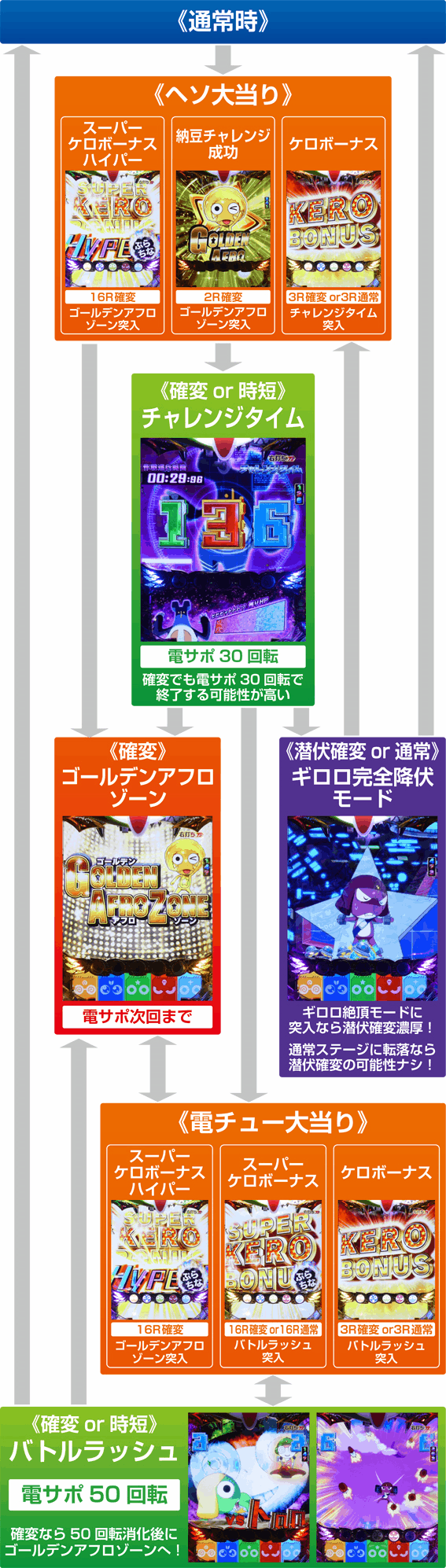 初当り後は大半が確変or時短30回転の「チャレンジタイム」に突入。チャレンジタイム30回転消化後は、確変の場合の一部は次回大当りまで電サポが継続する「ゴールデンアフロゾーン」に昇格するが、昇格しなかった場合は潜伏確変状態となる。「ギロロ完全降伏モード」中は潜伏確変の可能性があり、「ギロロ絶頂モード」に移行すれば潜伏確変濃厚だ。逆に、通常ステージに移行した場合は、潜伏確変中の可能性がなくなる。なお、電サポ中&潜伏確変中に確変を引いた場合は、必ず次回大当りまで電サポが継続するため、潜伏確変状態となることはない。