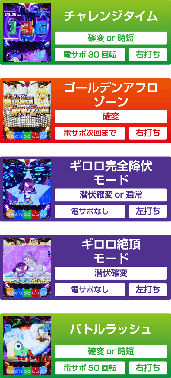 初当りのほとんどは30回転の電サポモード「チャレンジタイム」に移行し、演出に成功すれば次回まで電サポが付く「ゴールデンアフロゾーン」に突入する。チャンスタイムが終了した場合は電サポなしで潜確or通常の「ギロロ完全降伏モード」に移行。規定回数滞在後に「ギロロ絶頂モード」に移行すれば潜確濃厚となる。