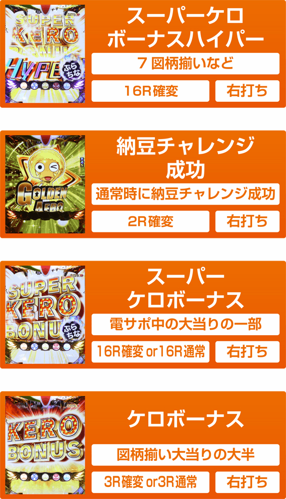 電サポ中にのみ当選する可能性がある16R確変or16R通常。大当り終了後はバトルラッシュに突入する。16Rは確変の可能性が高いので、スーパーケロボーナス後のバトルラッシュは確変である可能性が高い。