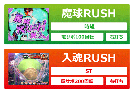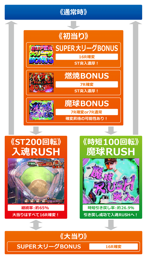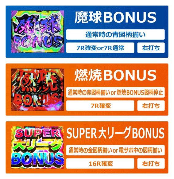 初回大当りがSUPER大リーグBONUSor燃焼BONUSならST突入濃厚。魔球BONUSは魔球RUSH(時短100回転)突入の可能性が高いが、7R確変へ昇格することもある。電サポ中の大当りはすべて16R確変&ST突入となるぞ。