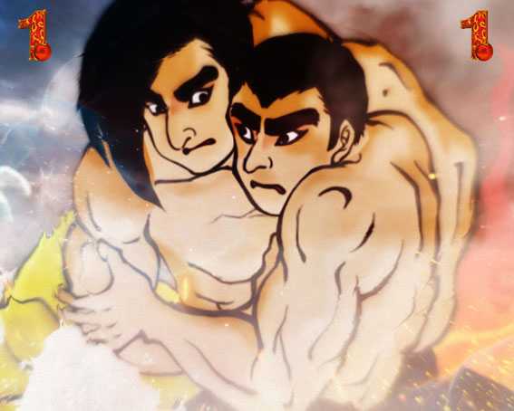 浮世絵風の飛雄馬と花形が相撲…ではなく最終的に野球で対決!