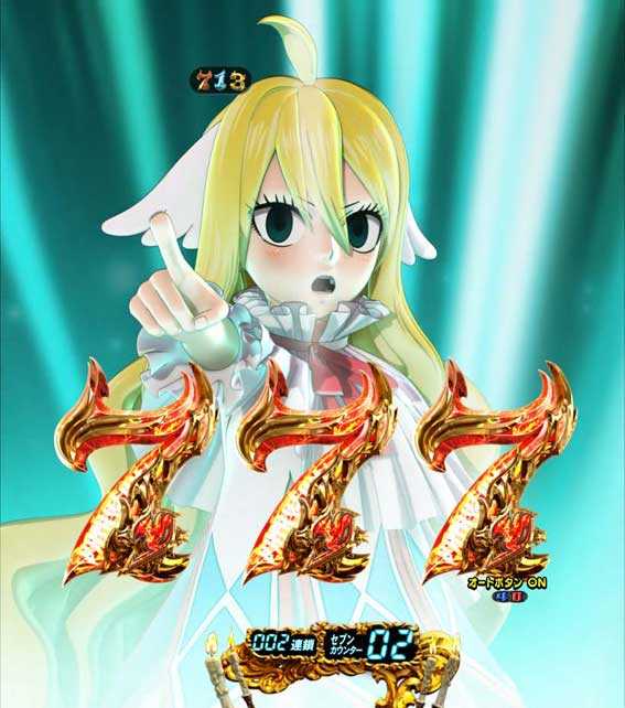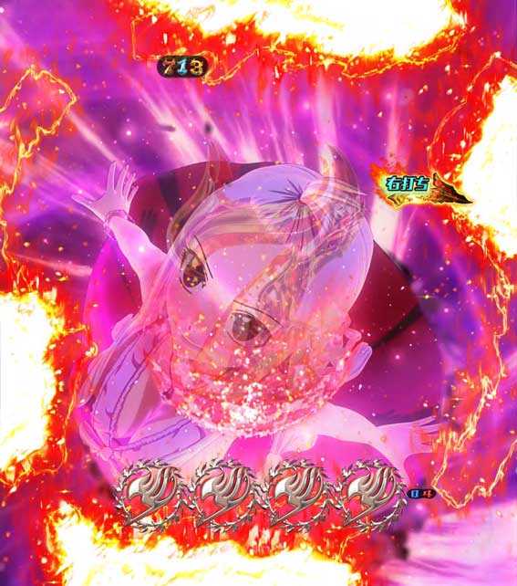 図柄揃い直後は7図柄揃いへの昇格演出が展開(発生しない場合もあり)。ナツが火を吹いて7図柄が揃って出現すると昇格濃厚だ。