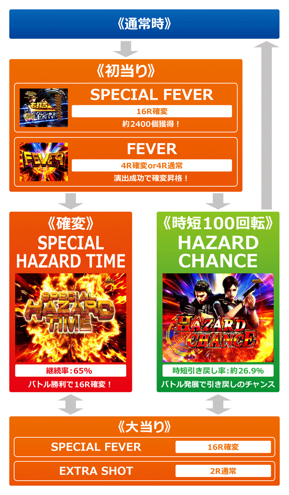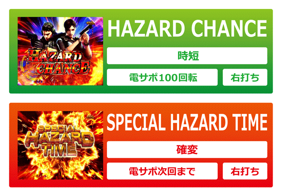 通常時に7以外の図柄が揃うと4Rの確変or通常大当りに当選。ラウンド中はボタン演出が発生し、ボタンPUSHで役物が作動すれば4R確変&SPECIAL HAZARD TIME突入、役物非作動なら4R通常&HAZARD CHANCE突入となる。