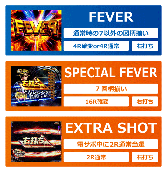 通常時に7以外の図柄が揃うと発生する4R大当り。ラウンド中演出成功で4R確変、失敗で4R通常&時短突入となる。なお、3図柄揃いからの「FEVER」は確変大当り濃厚だ。