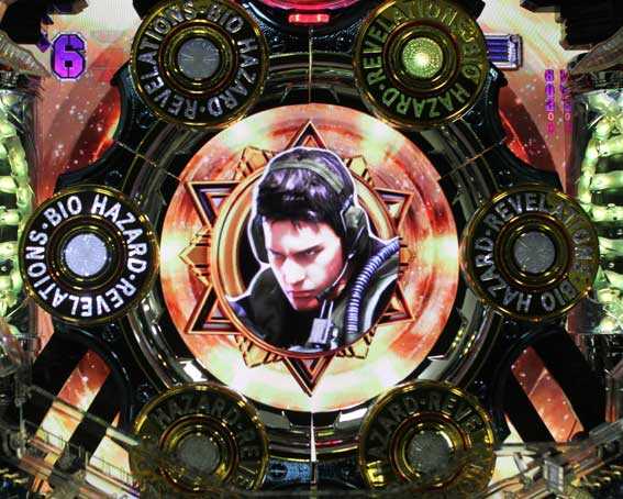 本機はカプコンの人気ゲームとのタイアップ機で、スペックは大当り確率1/319.7、確変突入率40%(電チュー65%)・次回まで継続する確変ループタイプだ。初当り3・7図柄揃いなら確変「SPECIAL HAZARD TIME」へ、その他の図柄はラウンド中の演出によって確変が決まる仕組み。通常大当りの場合は時短100回の「HAZARD CHANCE」に突入。電サポ中は16R・約2400個の割合が65%もある。