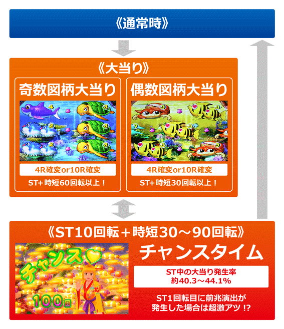 エンディング画面で金魚群が出現すれば保留内連チャン濃厚。金魚群が出現せずとも、画面タッチで出現することもあるぞ。また、「チャンス」の文字の後ろにあるマークには設定推測の秘密が隠されている!?