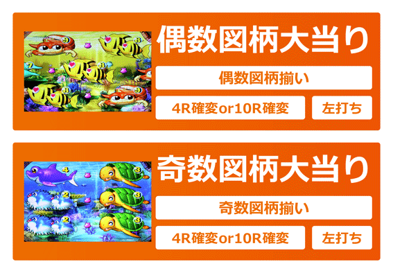 基本的にショート告知は大当り以上で、ロング告知は奇数揃い濃厚。なお、ショート告知でも魚群予告と複合すれば奇数揃い濃厚だ。