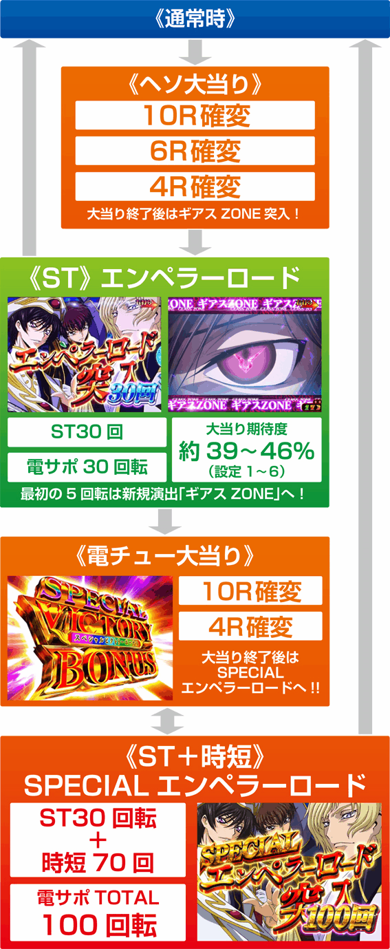 『CRコードギアス 反逆のルルーシュ~エンペラーロード~』が、遊びやすい設定付きパチンコになって帰ってきた。本機『モードぱちんこ コードギアス 反逆のルルーシュ~お気楽バージョン~』は、確変ループタイプだった前作とは異なるST機。初当り後に突入するST30回転の「エンペラーロード」を突破して、「SPECIALエンペラーロード」に突入させられるかどうかが、出玉性能を大きく左右する仕様となっている。お気楽バージョンだけに搭載された新演出や、設定推測要素は要チェックだ!
