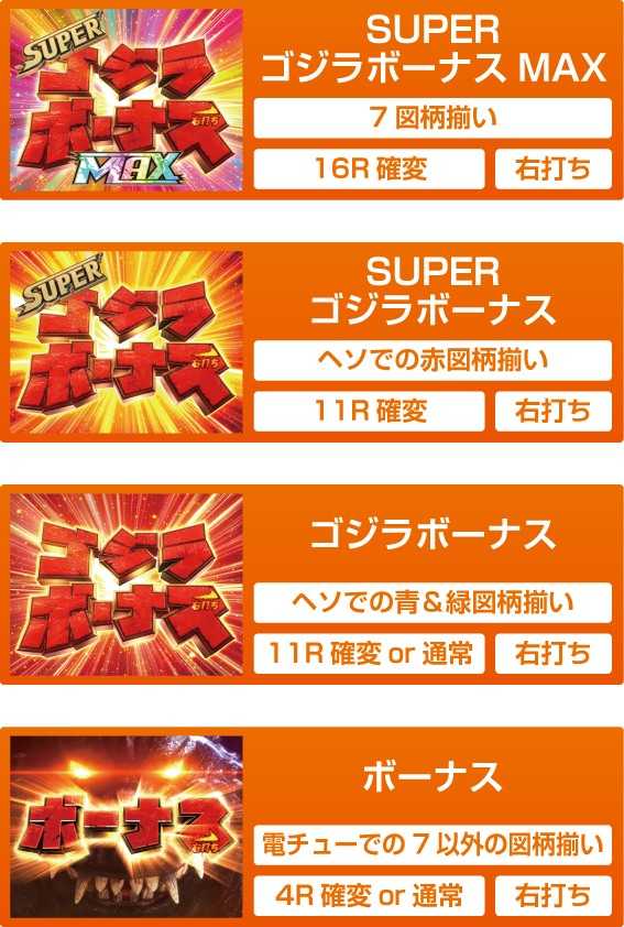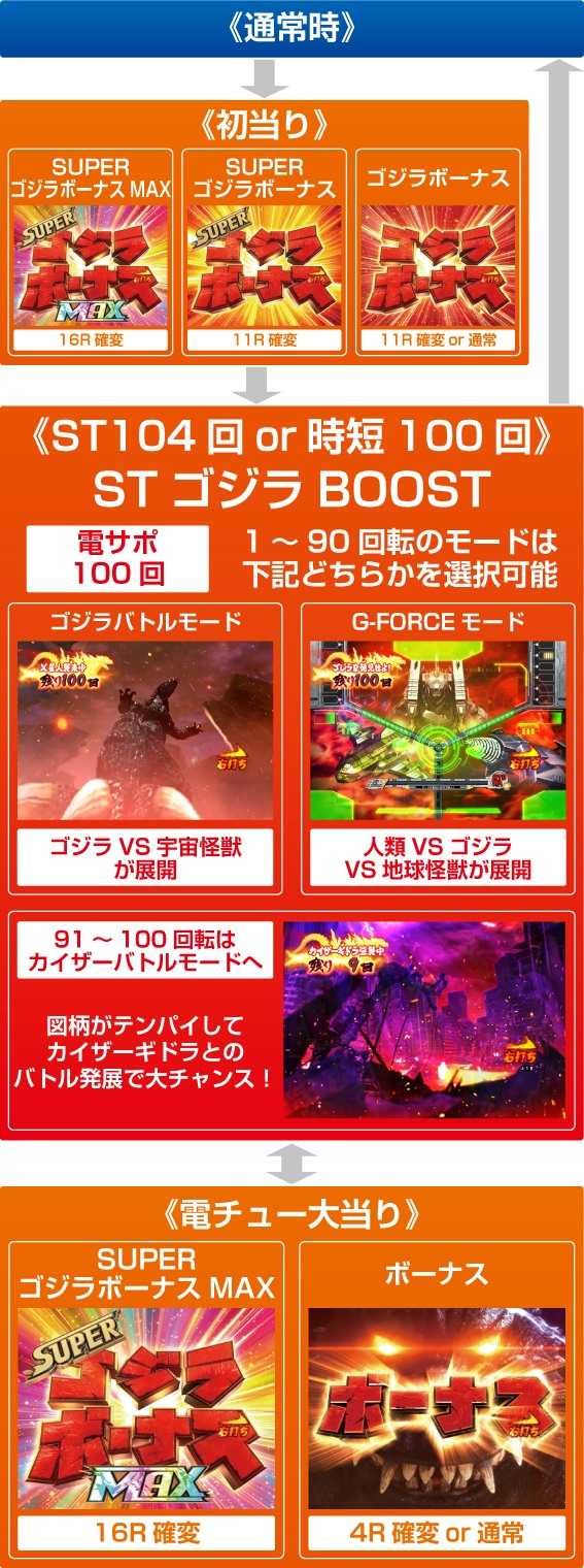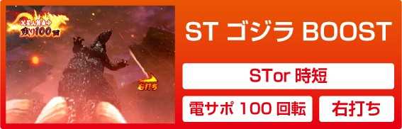 本機はSTでも時短でも電サポ100回の「STゴジラBOOST」に突入する。SUPERゴジラボーナスMAX&SUPERゴジラボーナス後はST濃厚だが、ゴジラボーナス&ボーナス後はSTか時短か分からない仕様となっている。