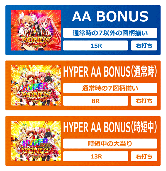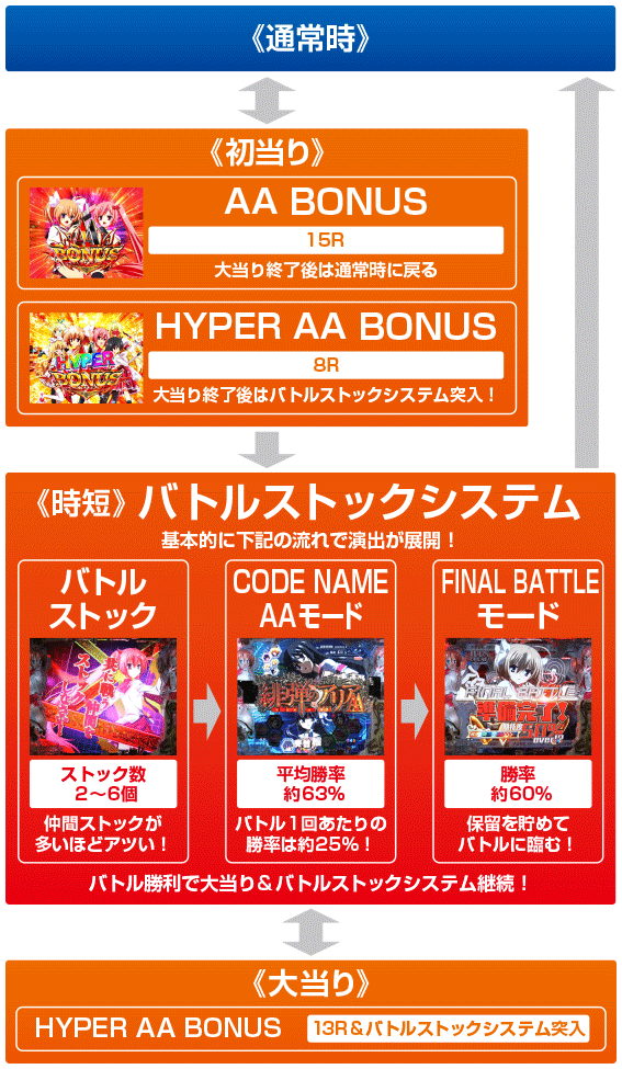 時短中の大当りはすべて「HYPER AA BONUS」(13R)となる。終了後は再度バトルストックシステムに突入する。