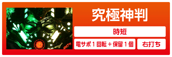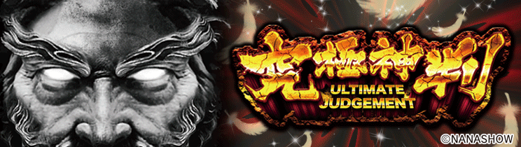 7以外の奇数図柄揃いによる初当り中に4R目を消化すると発生。ボタン連打で天使&悪魔の役モノを開放させ、ゼウスが登場すれば時短「究極神判」へ突入濃厚。失敗時は残りの5~8Rがスタートする(時短突入はナシ)。ボタン連打ではなく一撃だと超チャンス!? なお、大当り中に流れる楽曲やボイスは、JUDGEMENTで天使or悪魔のどちらを選んだかにより変化する(他のリーチで当たった場合は天使固定)。