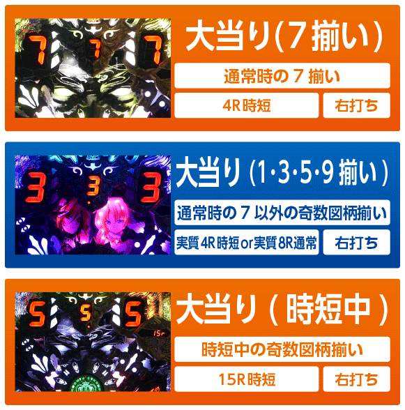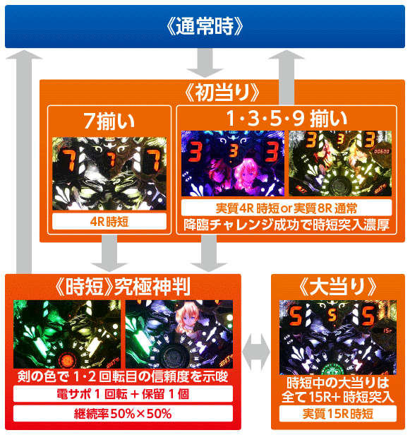 7以外の奇数図柄揃いによる初当り中は「降臨チャレンジ」が発生。演出成功で4R+究極神判突入濃厚、演出失敗で8R大当りとなる(時短突入はナシ)。