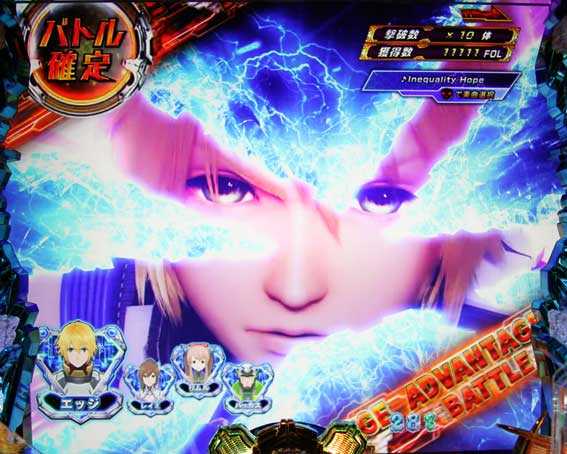 本機はスクウェア・エニックスから発売された人気RPGとのタイアップ機。スペックは大当り確率1/229.1、確変突入率80%・50回転+αまで継続、転落確率1/234.0の転落抽選タイプ。初当り後は主に電サポ50回転の「ディサイシブバトル」に突入し、50回転目の演出に成功すればバトル終了まで確変&電サポが継続する「アドバンテージバトル」に突入する仕組みだ。