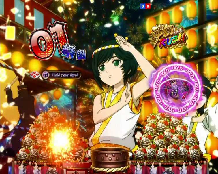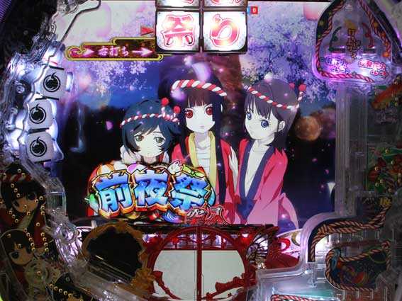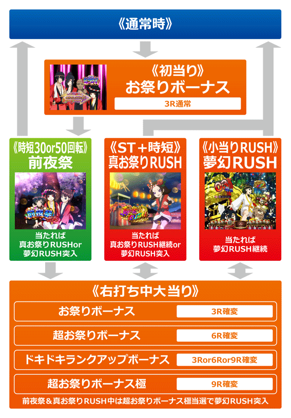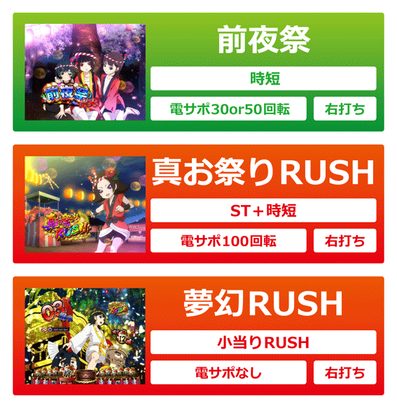 初回大当りはすべてお祭りボーナス(3R通常)で、大当り後は前夜祭に突入。前夜祭は30or50回転の時短で、ココで当たると80%が真お祭りRUSH突入、20%が夢幻RUSH突入となる。真お祭りRUSHは電サポ100回転(ST+時短)で、大当り割合については前夜祭中と同じだ。