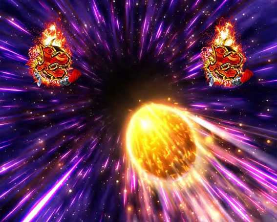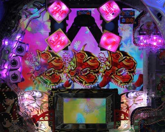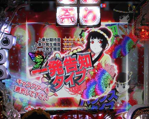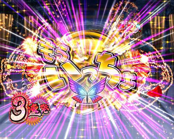 3Ror9Rのランクアップ型確変大当り。ボタンPUSH、または打ち上げ花火レバーを引いて「+○」と表示されると3R上乗せ、「MAX」が表示されれば9Rとなる。