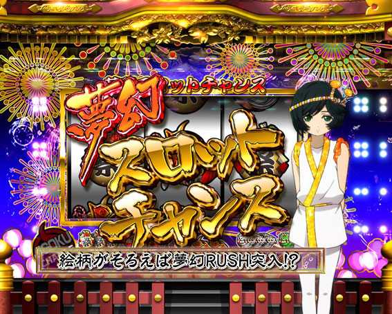 スペックは大当り確率1/73.6~64.8、確変突入率0%(電チュー100%)のV確変ST機。初当り後は時短30or50回転の時短「前夜祭」に突入し、ここで引き戻せば小当りRUSH付きの確変「夢幻RUSH」か、電サポ100回のST+時短「真お祭りRUSH」のいずれかに突入する。さらに夢幻RUSH中の大当りはすべて夢幻RUSH再突入するところも特徴だ。