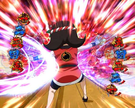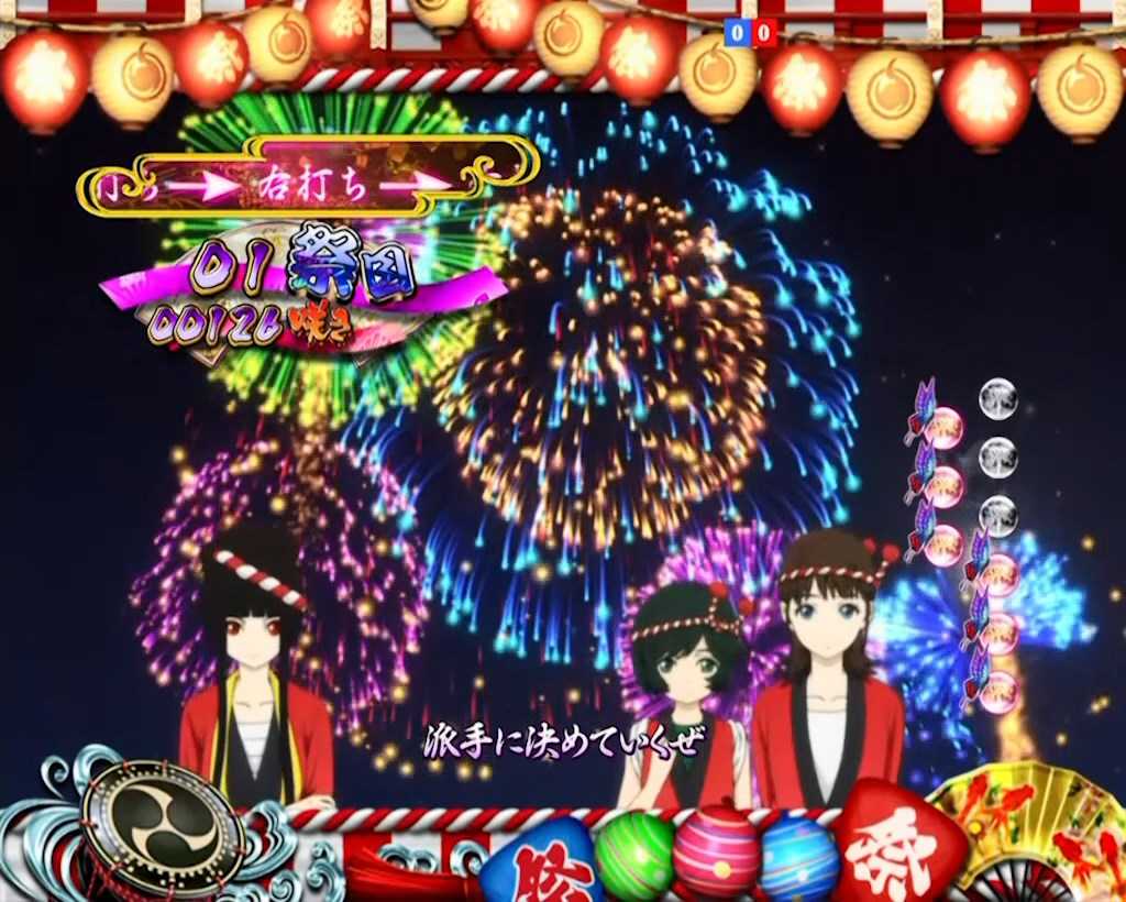 キャラカットイン時にボタンPUSHで花火玉を上乗せ。キャラの種類や背景の色が重要!?