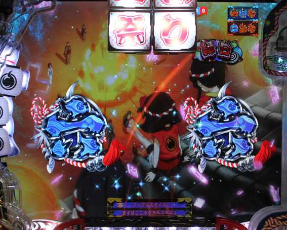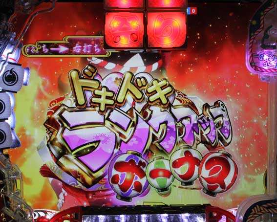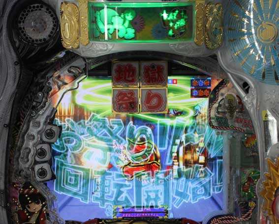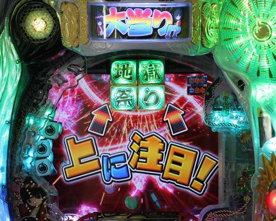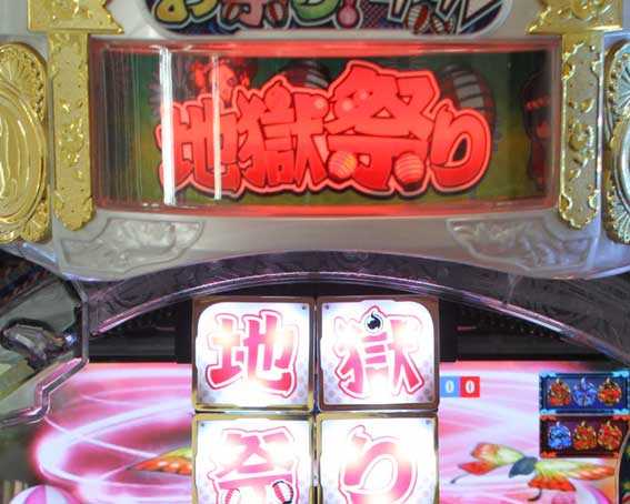 液晶で「お祭りリール回転開始!」の文字が表示されると、筐体上部のリールが回転。停止した際に表示される文字の種類や、リールの色などによって信頼度が変わる。「地獄祭り」停止は期待大で、「大当り!?」停止なら超激アツ!?