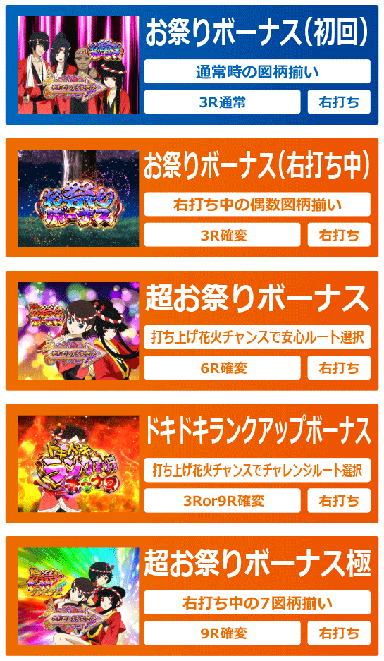 電サポ中or小当りRUSH中に打ち上げ勝負図柄停止で発生する、大当り選択演出。液晶に合わせてお祭りチャレンジで「安心ルート」と表示されている間に右打ちすると6R大当り、「チャレンジルート」と表示されている間に右打ちすると3Ror9Rのランクアップボーナスが発生。