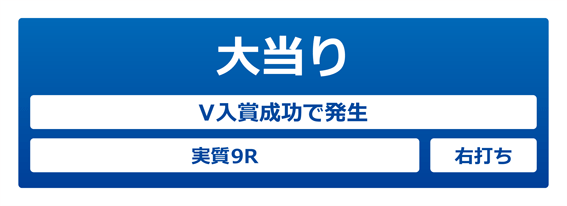 盤面中央の役モノ内にあるVに玉が入ると発生。ラウンド数は9R(実質)で、終了後は右打ちを続けるだけでさらに2回の大当りを獲得できる。