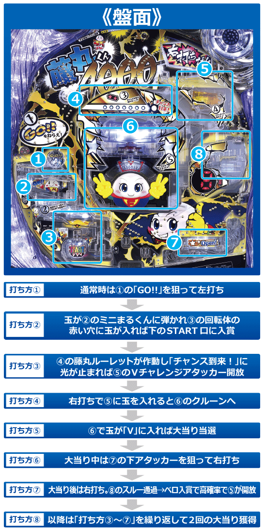 打ち方は、まず盤面左にあるGOを狙う。GOを通過した玉がGO下部に搭載されたミニまるくんに弾かれ、その下にある回転体の赤枠の穴に入れば下のスタートへ入賞し藤丸ルーレットが始動。ルーレットではチャンス到来で停止すれば盤面右側にあるVチャレンジアタッカーが開放するので、玉を打ち込もう。入賞した玉はいったん貯留され、クルーンを通過して「藤丸Vキャッチ」役モノに向かい、藤丸くんがタイミングよくVゾーンで受け止めれば大当りとなる。