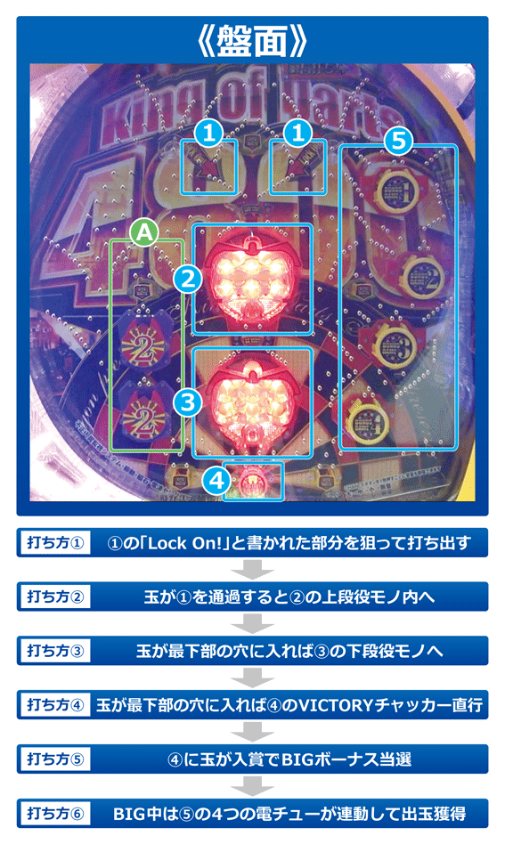玉が①の釘をクリアすると②の上段役モノへ移動し、最下部の穴を通過すると下段役モノへ。下段役モノの作りは上段役モノとほとんど同じで、最終的に玉が役モノ最下部の穴を通過すれば④のVICTORYへ玉が入賞してBIGボーナス(出玉約4800個)が発生する。