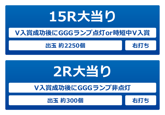 V入賞後にGGGランプ点灯で発生する、約2250個の払い出しがある大当り。初回15R大当り後は時短突入、時短中の15R大当り後は通常時に戻るか時短再突入となる。