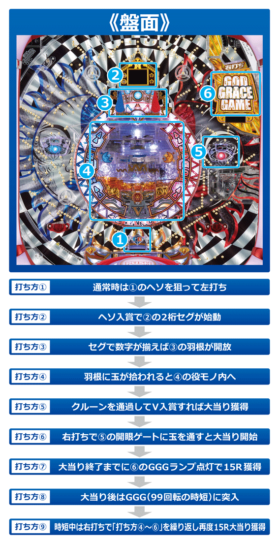 ヘソに玉が入ると2桁セグが変動し、数字が揃えば羽根が開放(揃う数字は羽根開放回数を示唆)。開いた羽根に玉が拾われ、役モノ内のクルーンを突破してV入賞すれば大当り獲得だ。続いて右打ちで開眼ゲートに玉を通すと大当りが始まり、ラウンド終了までにGGGランプが激しく光れば実質15R昇格&時短「GOD GRACE GAME」突入。何も起こらなければ実質2Rとなり通常時に戻る。