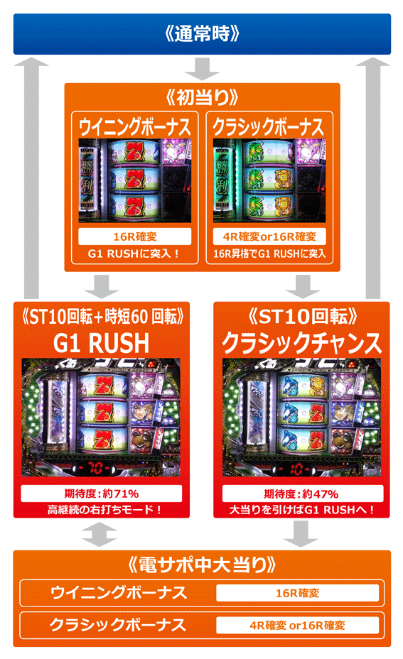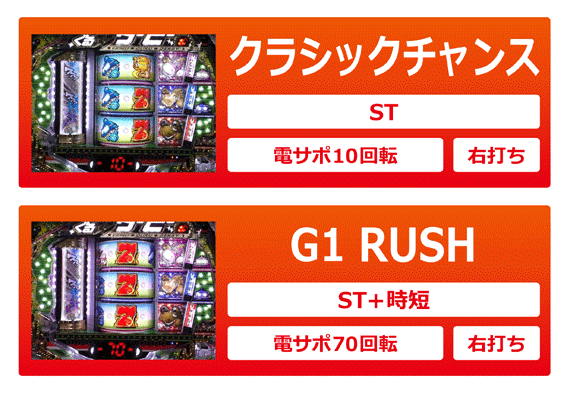 初当りは4R確変がメインで、終了後はST10回転のクラシックチャンスに突入する。そこで大当りを引けばST10回転+時短60回転のG1 RUSHに突入し、継続率約71%の連チャンを期待できる。また初当りが16R確変の場合はG1 RUSHに直行するが、初回での突入率は5%とかなりレアだぞ。