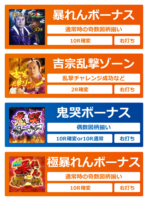 先読み演出 | ・保留変化 (赤「暴」・金「暴」・吉宗) ・チャンスゾーン (鬼跋扈背景・御座の間) |