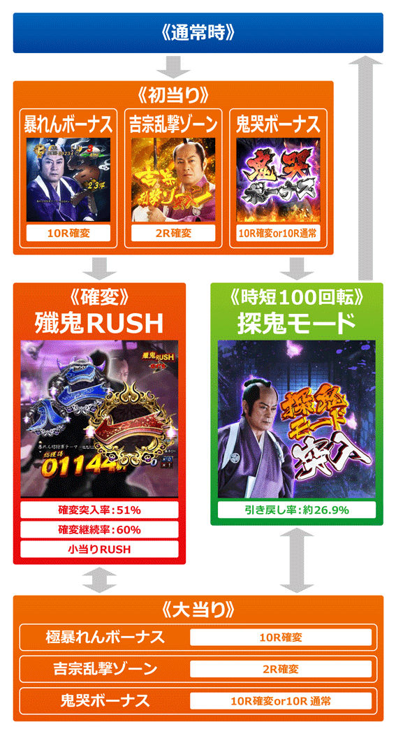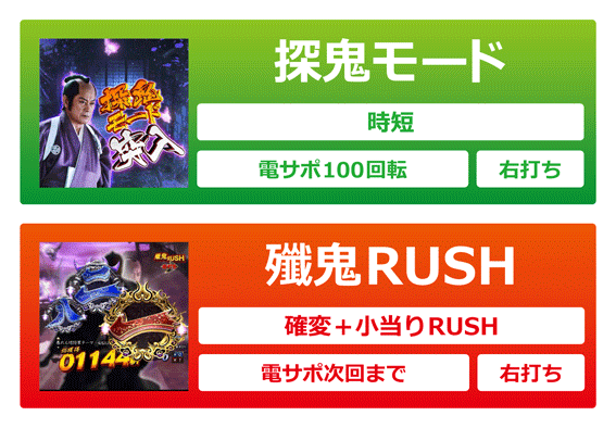 変動中演出 | ・擬似連続予告(3連) ・鬼化イベント ・勧善懲悪ゾーン ・弓矢予告 |