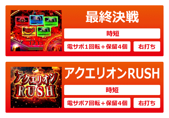 アクエリオンRUSHは時短7回+残保留4個で構成。引き戻し期待度は約80%と高く、電チューからの大当りは全てアクエリオンRUSHへ突入するので、ロングループの期待大となる。RUSH中の演出モードは全5種類から選択可能だが、選択時に第6のモード「ロゴスモード」が加わることが……!? 最終変動のアツさも継承されており、仮にハズれてもリザルト画面では流れ星……もとい、涙が落ちれば歓喜の瞬間が訪れるぞ。