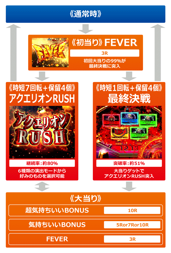 電サポ中の図柄揃いで発生する5Ror7Ror10R大当り。突入時に獲得出玉(ラウンド数)が決定される。終了後はアクエリオンRUSHに突入。