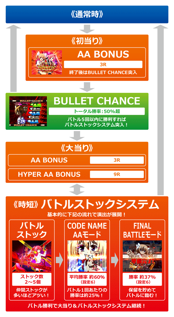バトルストック後にCODE NAME AAモードではなく、上記いずれかの演出が発生すれば超激アツ。なお、バトルストックにて「戦姉妹STOCK」が発生した場合は(超)ライトニングバレットチャンス発生濃厚!?