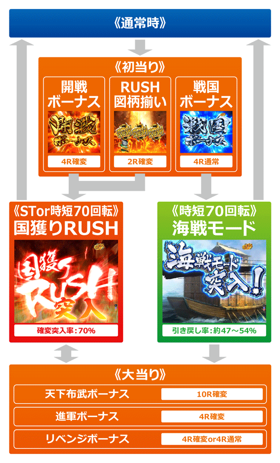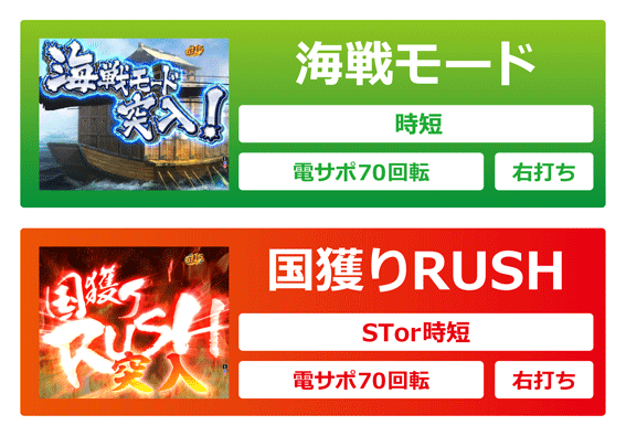 戦国ボーナス(初回4R通常大当り)後に突入する70回転の時短モードで、通常時と同様の演出が展開。また、引き戻し率が高いのも特徴だ。
