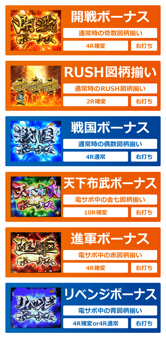 史実に残る有名な合戦が展開されるリーチで、全9パターンが存在。タイトルやエフェクトの色などのチャンスアップポイントに注目しよう。選択した大名に対応するリーチだと大チャンス!?
