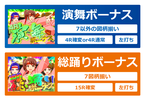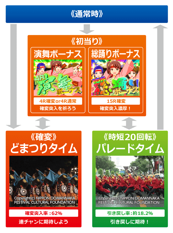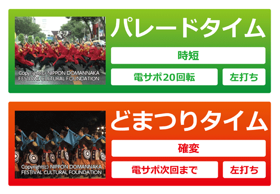 タイトルの「演舞」の文字色が赤なら4R確変なので、終了後はどまつりタイムに突入。緑だと4R通常なので、終了後はパレードタイムに突入する。