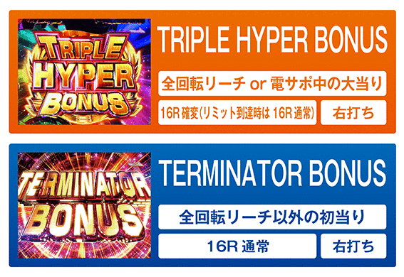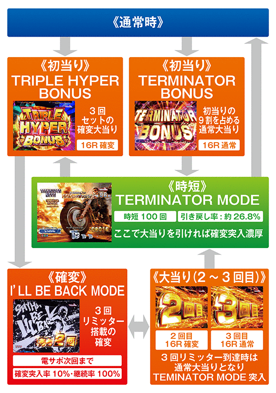 次回大当りまで継続の確変モード。確変継続率は100%だが、本機の確変は3回リミッター搭載なので3回目の大当りは16R通常大当りとなり、時短「TERMINATOR MODE」へ突入。なお、電サポ中の大当りの名称は1~3回目全て「TRIPLE HYPER BONUS」となる。