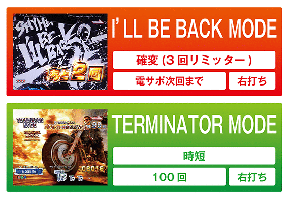 「TERMINATOR BONUS」後、または3回目の「TRIPLE HYPER BONUS」後に突入する100回の時短モード。ここで大当りを引き戻せれば確変突入=3回の大当りを獲得できる。確変突入のメインルートとなるモードだ。