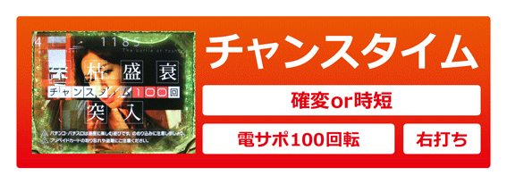 なお、電サポ中に大当りした後は100%チャンスタイムに突入する。チャンスタイムは確変から転落したかどうかに関係なく、必ず100回継続。100回消化後も確変の場合は潜伏確変となる。