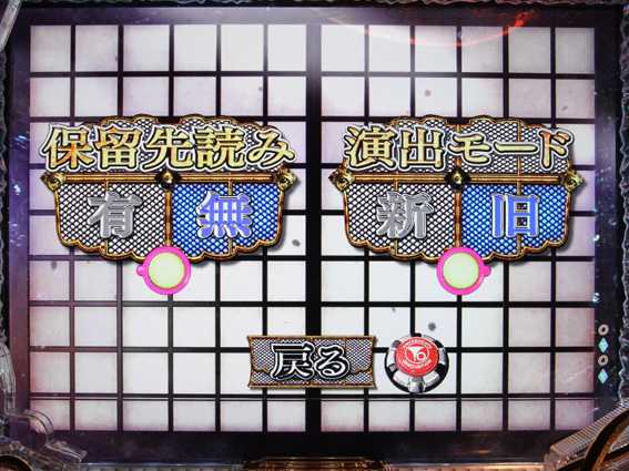 変動停止中や変動中に、巨大PUSHボタンの左右にある緑ボタンを押すと「保留先読みの有無」と「演出モード」を切り替えられる。賑やか演出を楽しみたいなら「保留先読みアリ&新演出モード」、『平家物語』ならではのリーチのアツさを楽しみたいなら「保留先読みナシ&旧演出モード」がオススメだ。