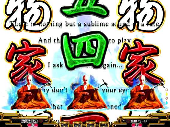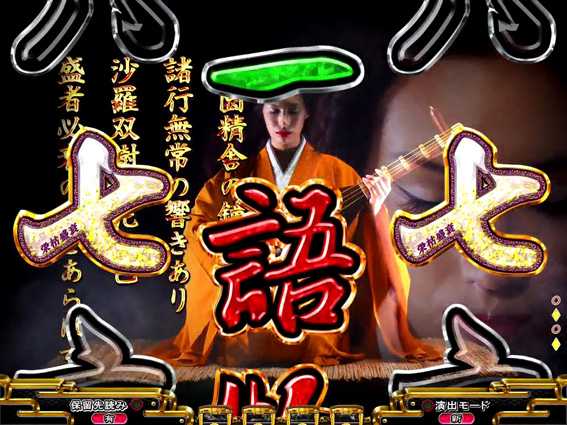 ノーマルリーチ後の背景に平家物語の「祇園精舎の鐘の声…」の文字が出現し、その後琵琶法師が開眼するとSPリーチに発展する。なお、背景文字の色が金だと大当り濃厚となるぞ!