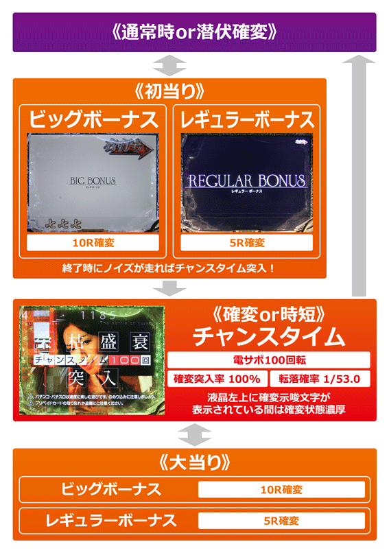赤図柄or七図柄が揃うと発生する10R確変大当り。初回当選時は終了画面でノイズが走るとチャンスタイムに突入。ノイズナシなら潜伏確変状態へ移行する。電サポ中の当選はチャンスタイム突入濃厚だ。