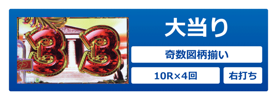 液晶で奇数図柄が揃うと発生。大当り1回あたりのラウンド数は10Rで、終了後は右打ちを続けるだけで、さらに3回の10R大当り(合計出玉は約5000個)を獲得できる。